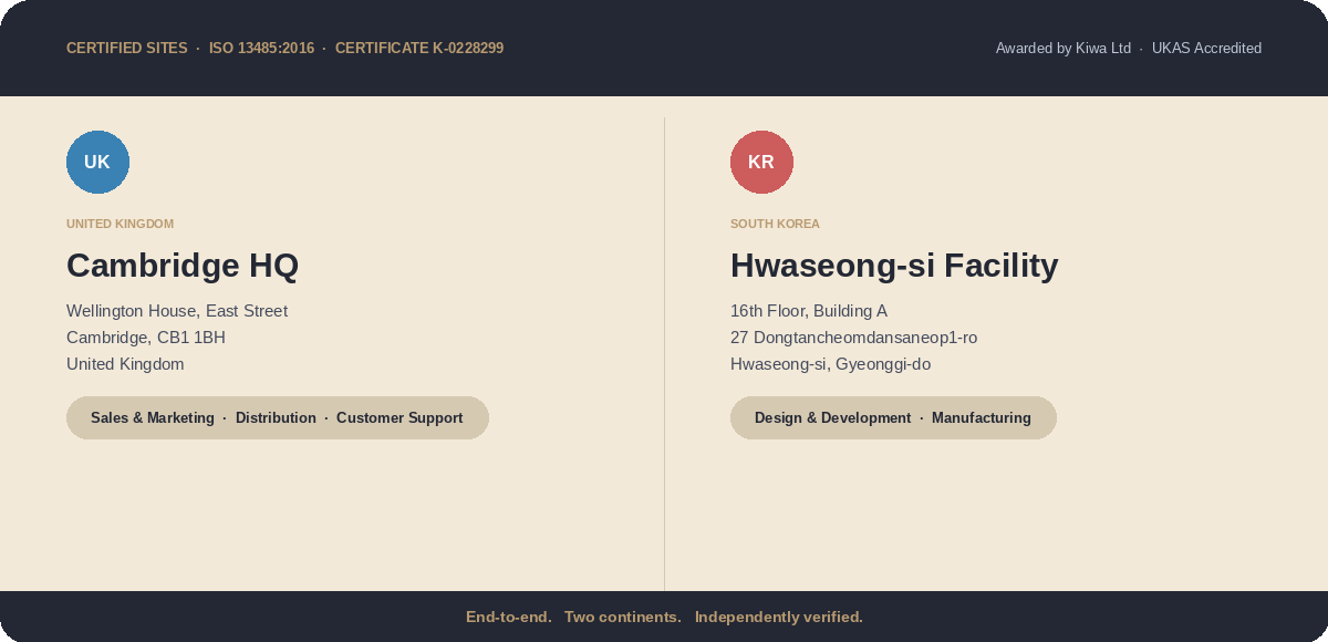 We are proud to announce that we have achieved ISO 13485 certification, the internationally recognised quality management system standard for Medical Devices, issued by Kiwa Ltd, a UKAS-accredited certification body. This marks a pivotal step in our mission to bring CUE1+ to people with Parkinson’s through healthcare systems worldwide.